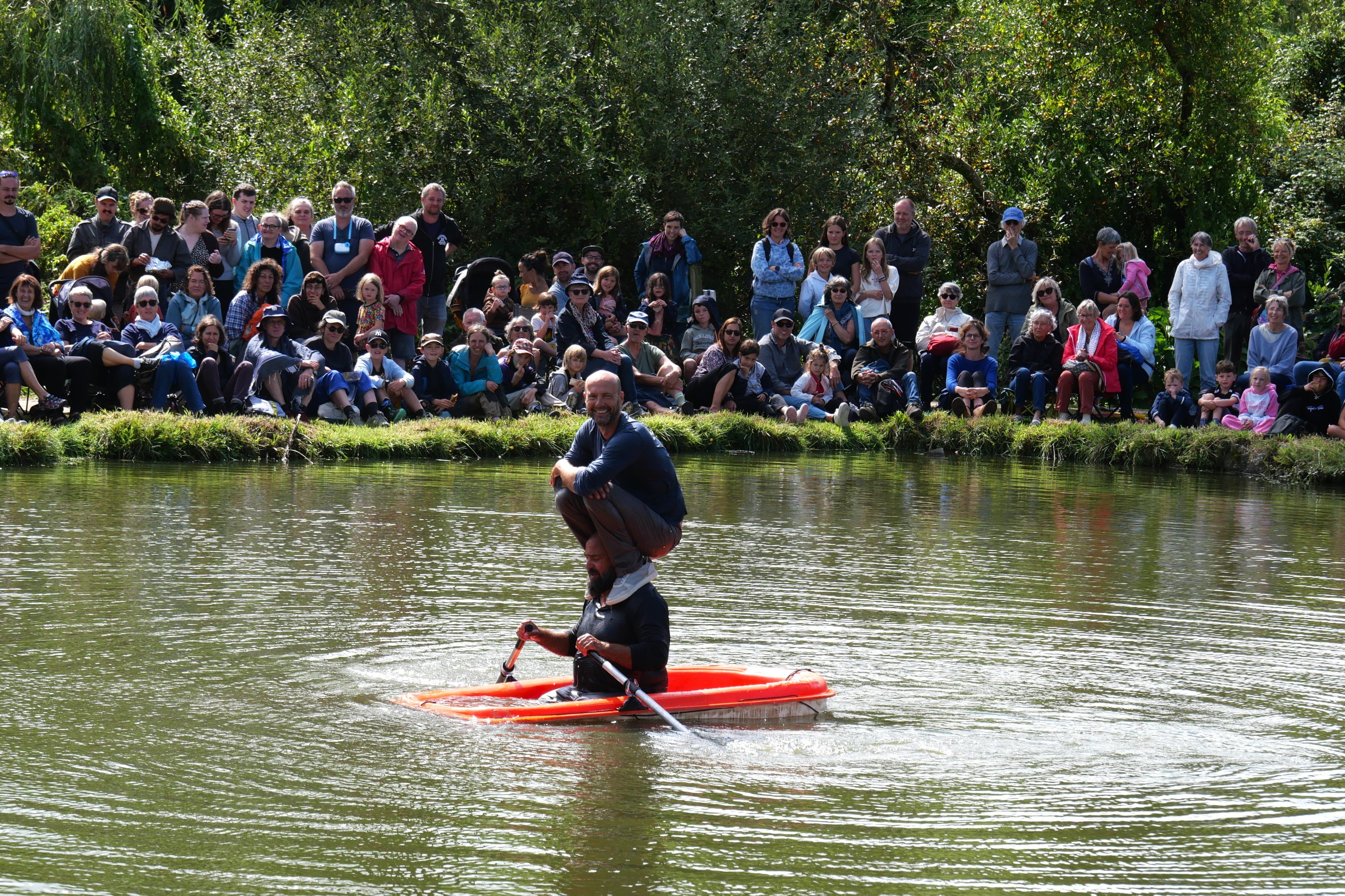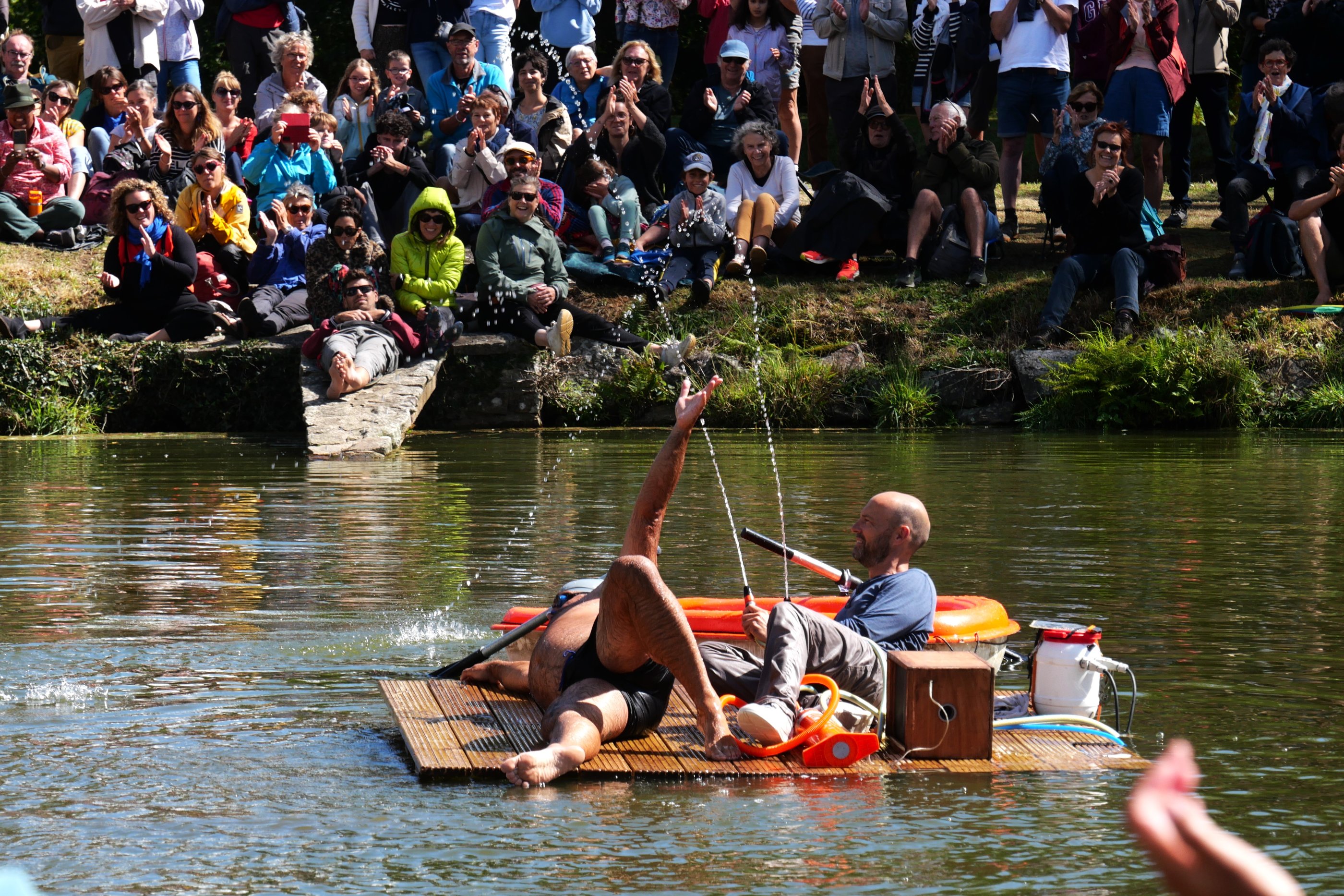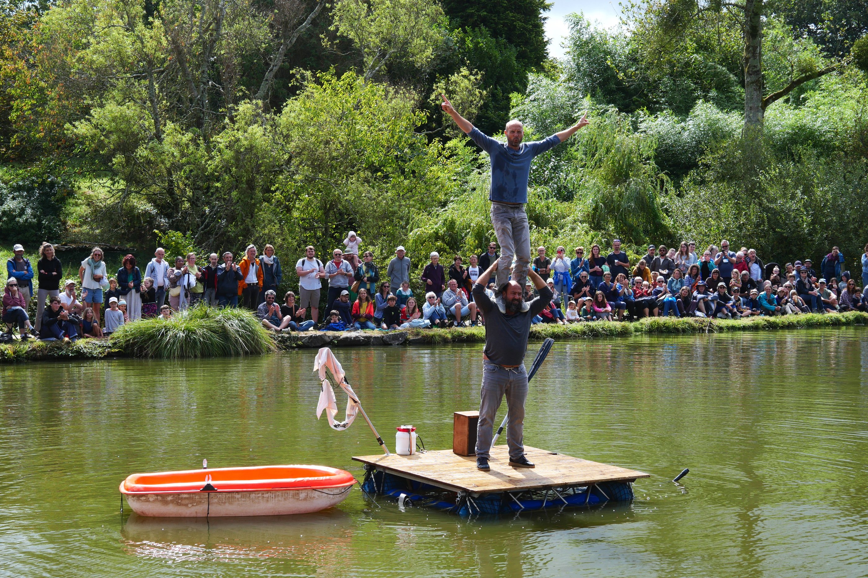 Au milieu de l’étang du Trévoux tangue une barque. Le spectacle aura lieu ici, sur ce radeau, stable, petit, suffisant s’il flotte jusqu’au bout sans chavirer. Mais avant de commencer, il reste encore quelques incontournables préparatifs, importants et dérisoires. L’important, c’est de garder le cap même quand tout vacille sous le poids de l’incertitude. Après la rue et le chapiteau, le duo Mickael Le Guen et Benjamin De Matteis prend le grand large ! Un spectacle fort, clownesque et acrobatique au rythme de l’eau.